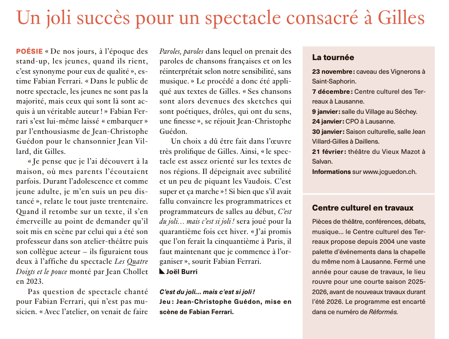« Les chansons de Gilles sont connues, bien sûr. Mais la saveur de ses textes a-t-elle toujours été vraiment perçue ? Pas sûr. Posées sur une musique, les paroles passent rapidement. Jean-Christophe Guédon propose de DIRE ses chansons et l’humour de Gilles se révèle alors comme jamais ! » Jean Chollet, metteur en scène et directeur de théâtres (Théâtre du Jorat, Espace Culturel des Terreaux, Espace St-Martial d’Avignon et Théâtre Le Bateau-Lune)